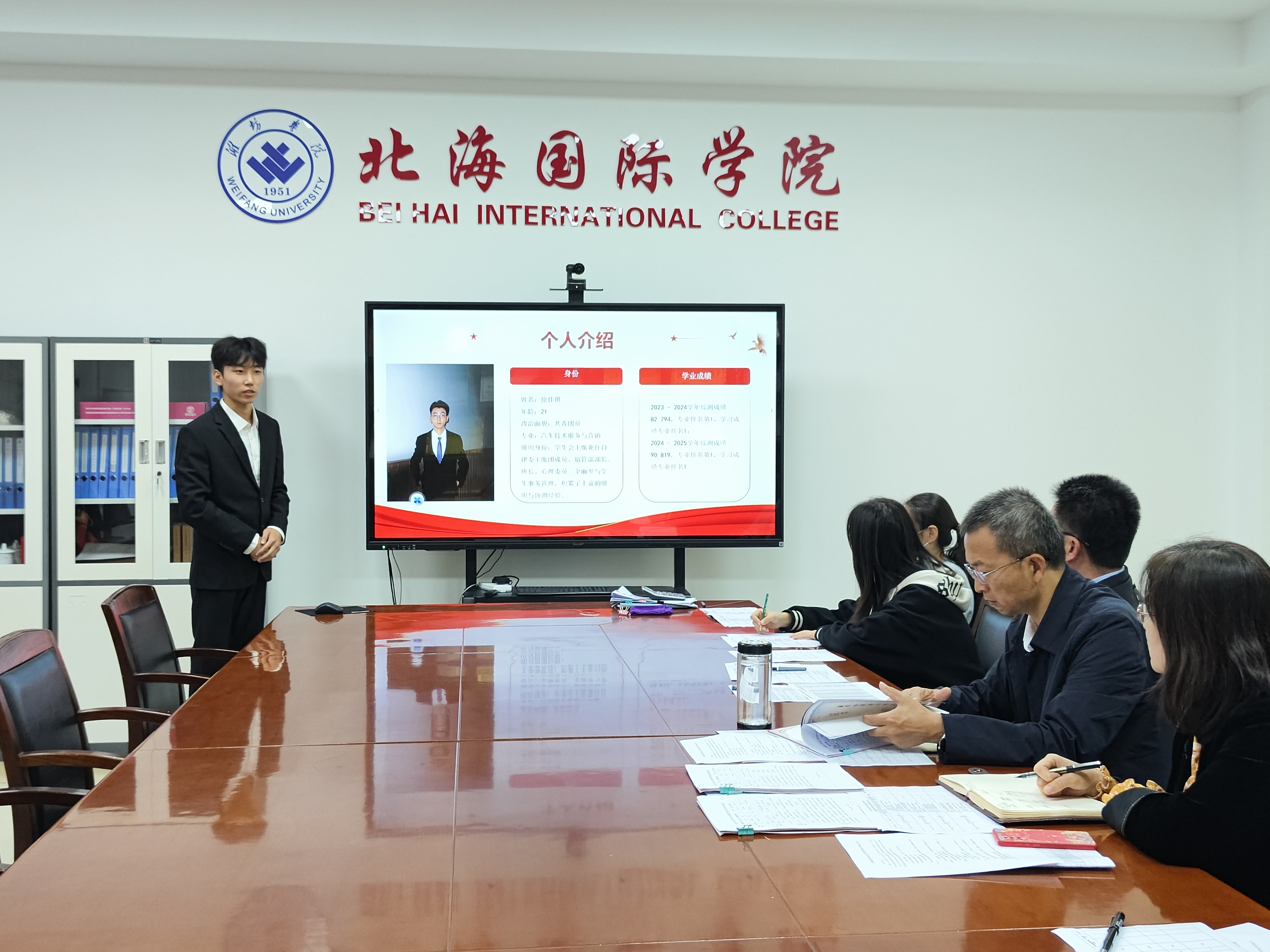 为选树品学兼优的学生榜样,强化奖学金育人导向,10月17日下午,北海国际学院2025年度省政府奖学金评选答辩会在7号楼7516会议室举行,学院党委书记兼院长韩建栋,党委副书记、副院长张晓丽,辅导员、教师代表及学生代表组成评审小组,对全体候选人进行综合评定。