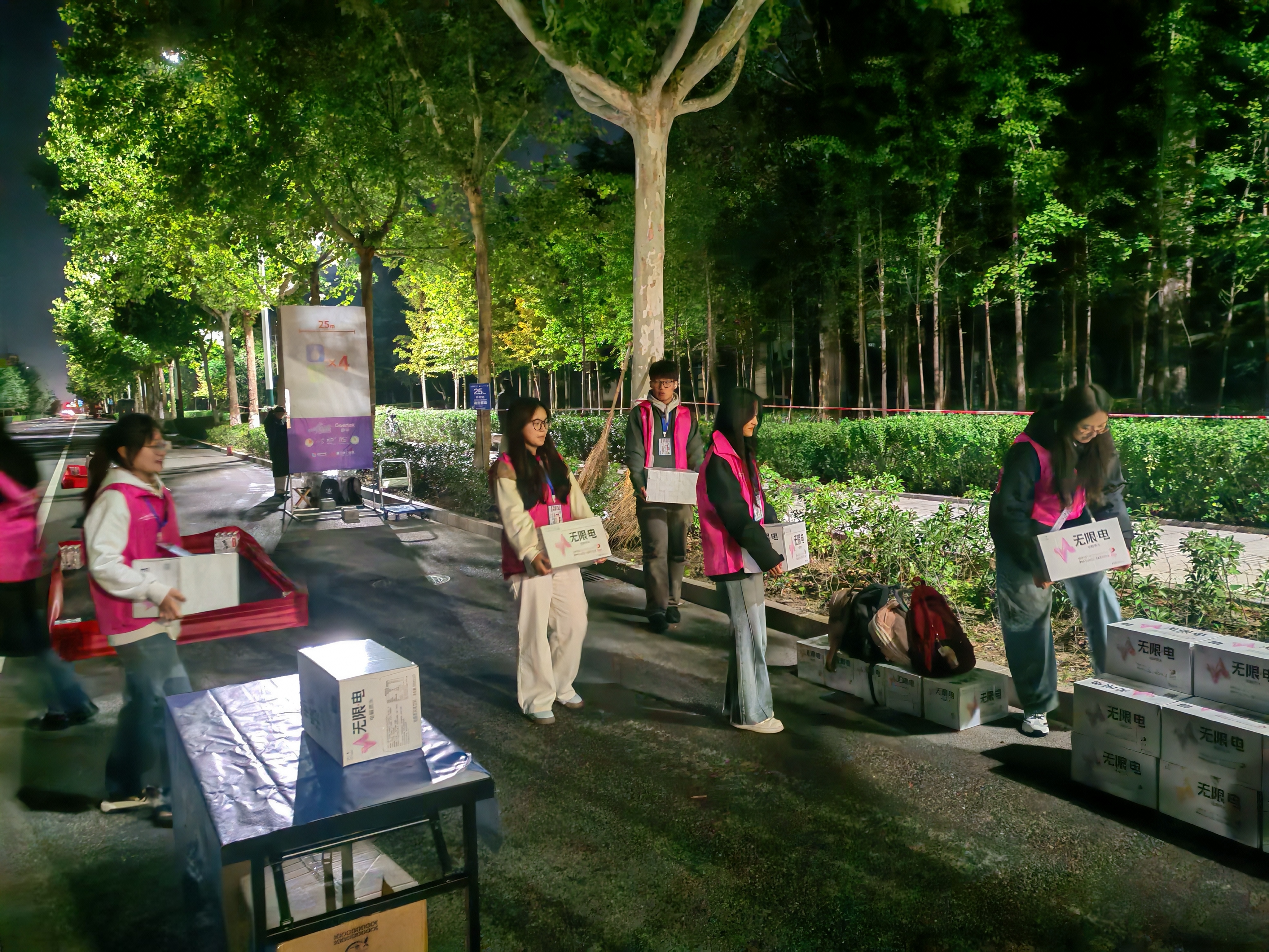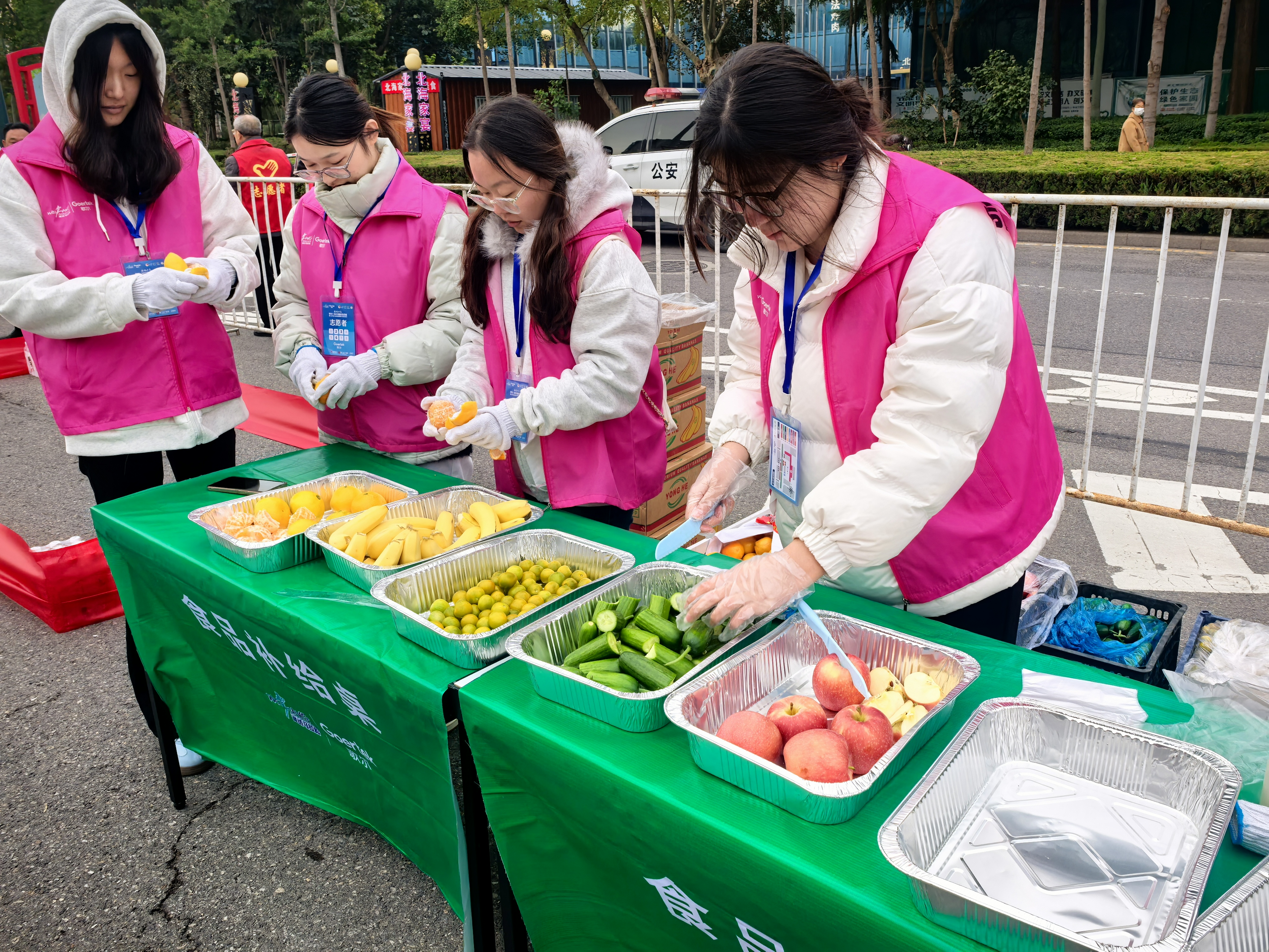 凌晨四点,天色未亮,身着统一红色志愿服的志愿者携带物资,在集合点迅速列队,分赴饮水、食品、海绵等补给点。作为赛事关键保障节点,各补给点志愿者抵达后立刻开启细致的赛前筹备:饮用水、功能饮料按杯整齐码放,确保选手快速取用;能量胶、香蕉等食品分类独立摆放,避免混乱;同时降温海绵提前浸润并分装至专用容器。七点整,所有志愿者全部就位,当发令枪响起,各岗位即刻进入服务状态,随时补充饮水与能量食品。当最后一波选手通过,志愿者们立即清理空瓶、包装等废弃物分类收入垃圾袋,实现“人走场清”,他们用行动诠释“不是跑者,却同跑全程”的担当。