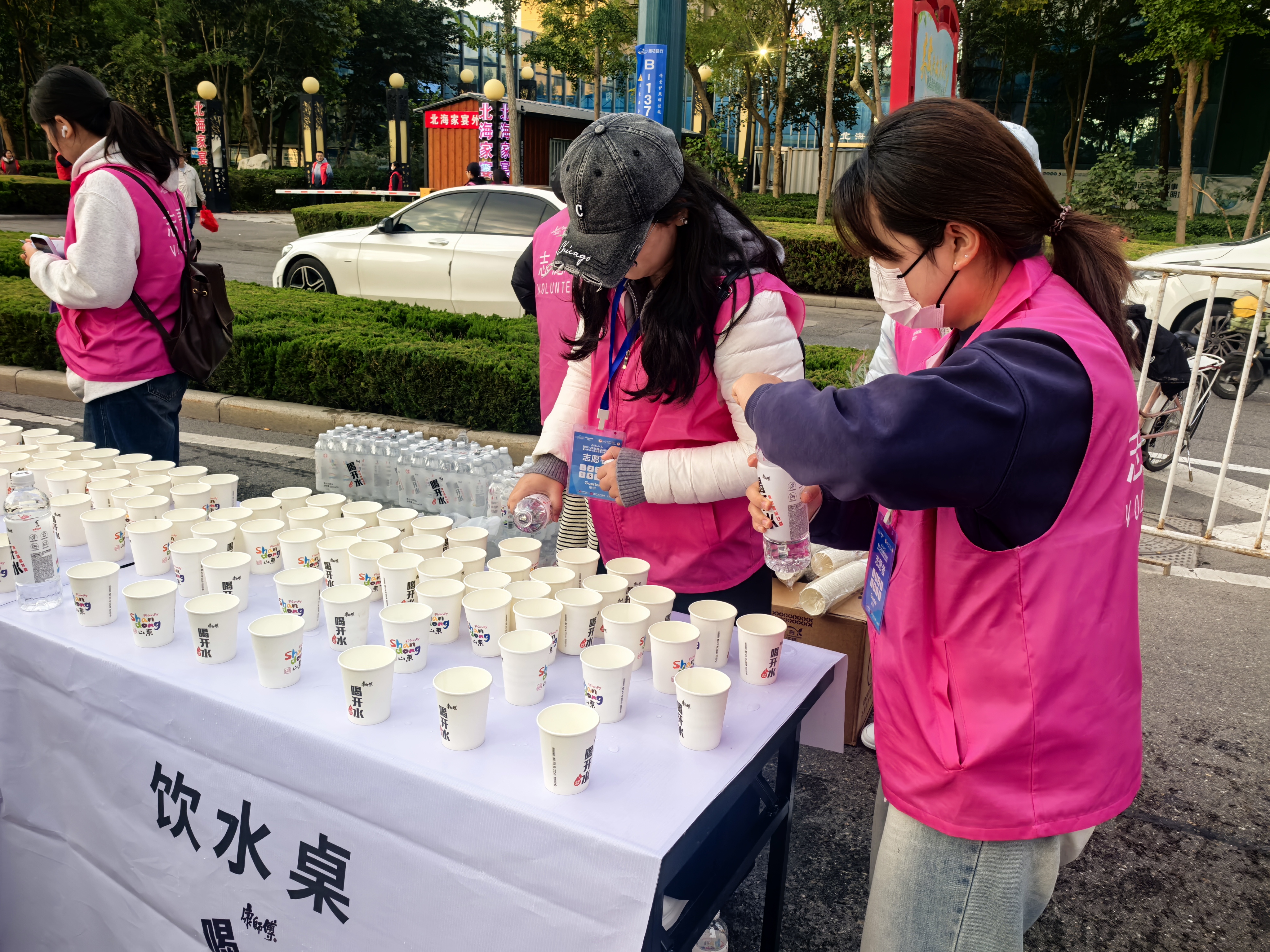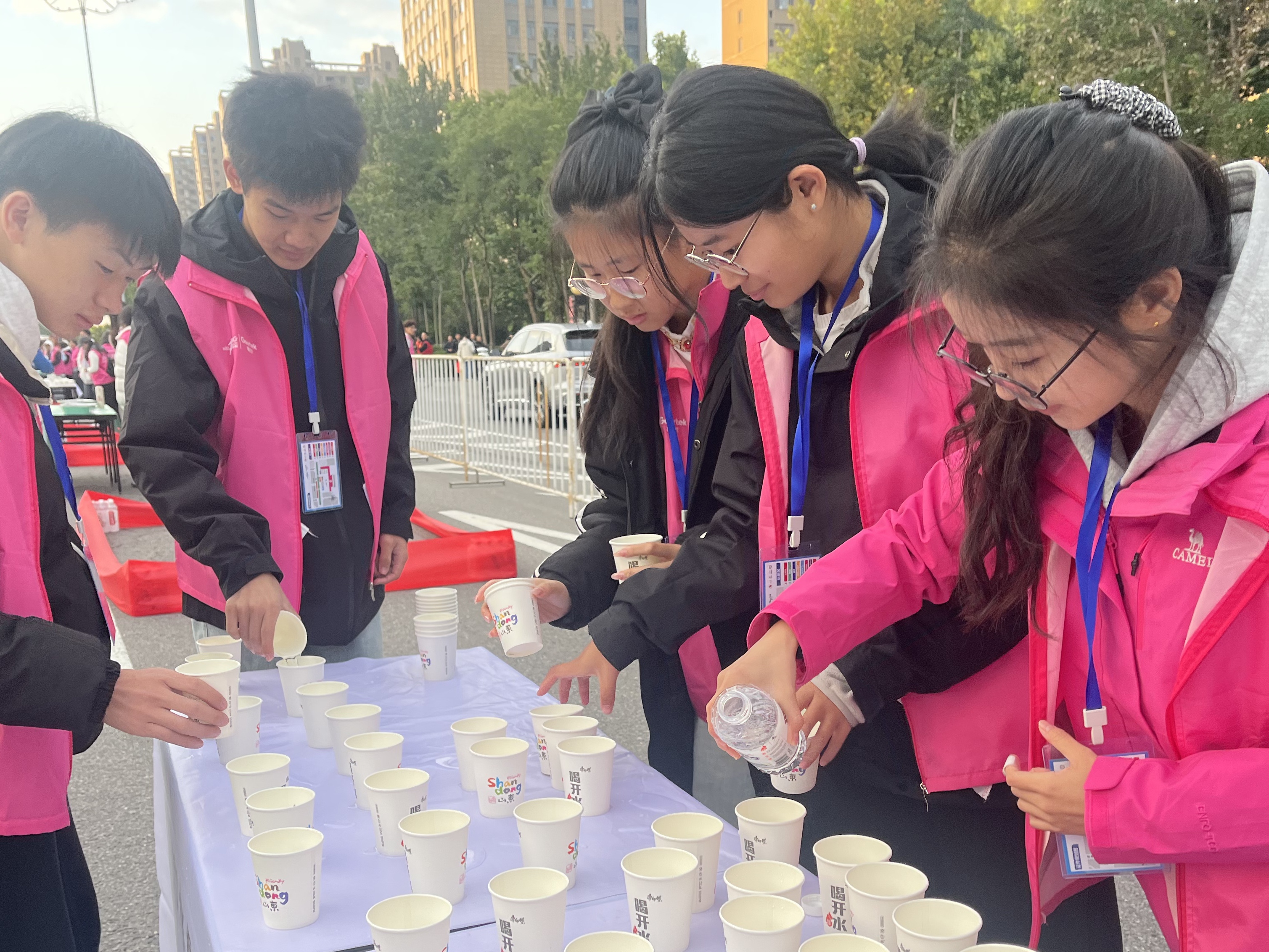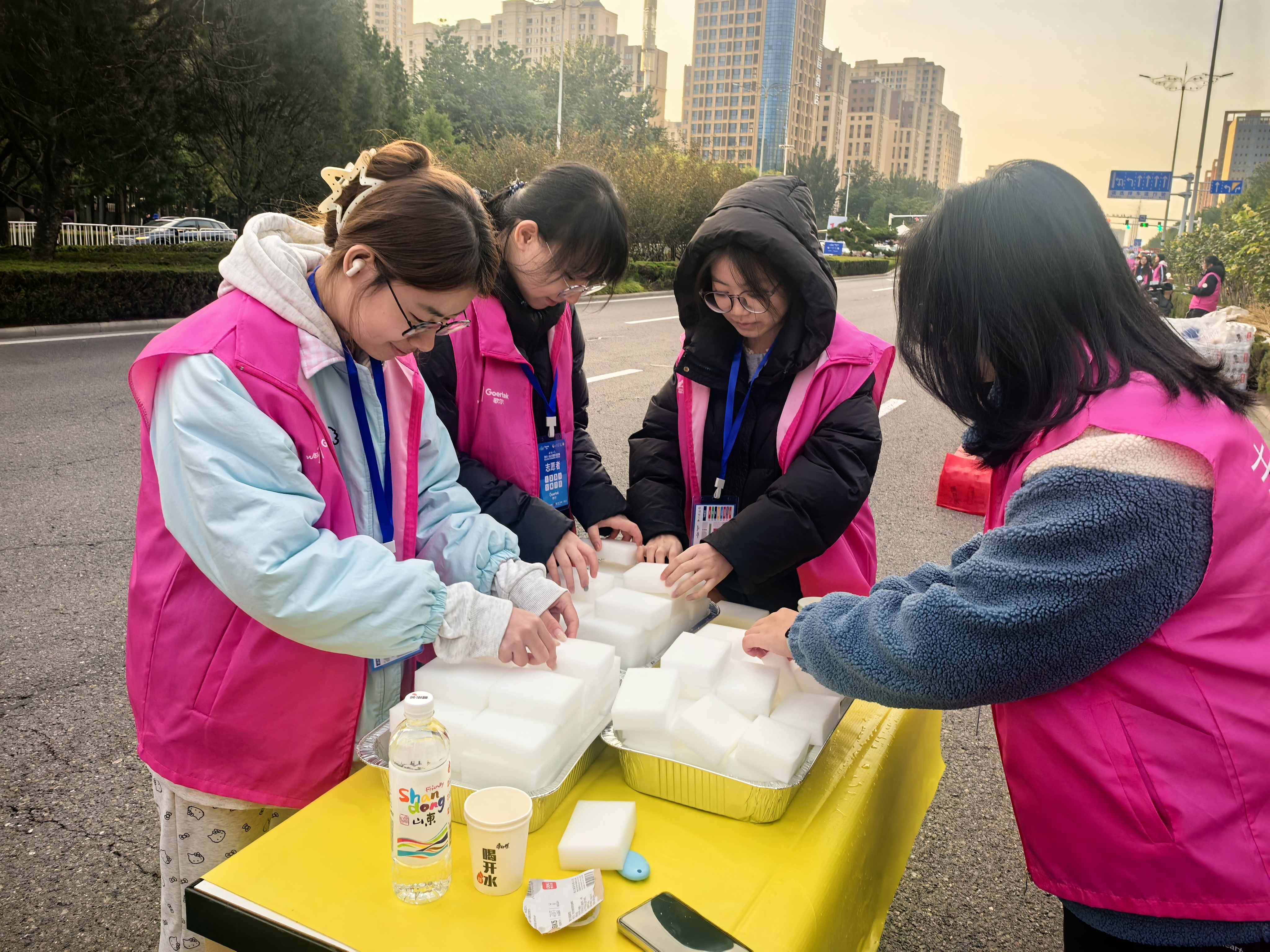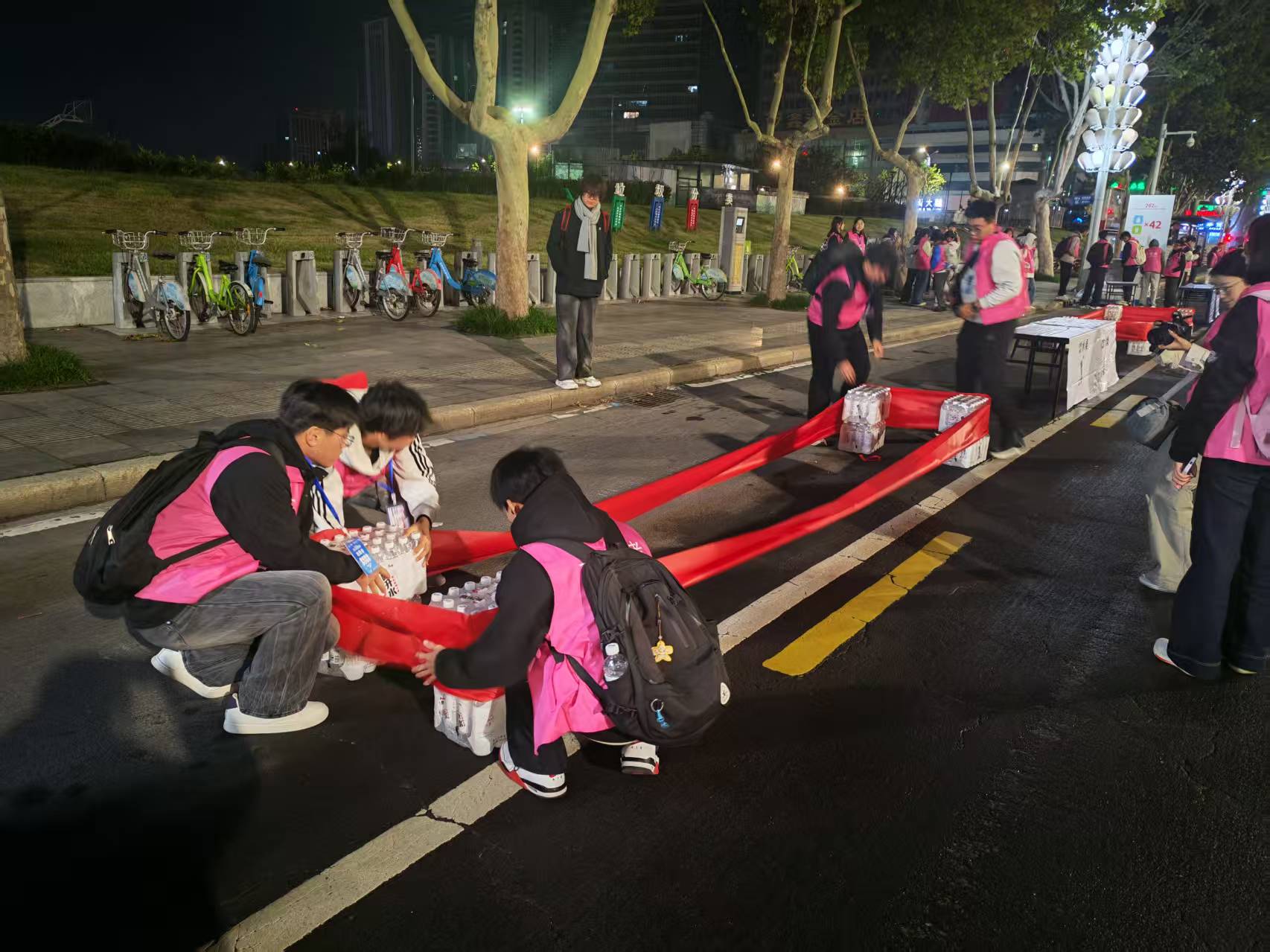 凌晨四点,天色未亮,身着统一红色志愿服的志愿者携带物资,在集合点迅速列队,分赴饮水、食品、海绵等补给点。作为赛事关键保障节点,各补给点志愿者抵达后立刻开启细致的赛前筹备:饮用水、功能饮料按杯整齐码放,确保选手快速取用;能量胶、香蕉等食品分类独立摆放,避免混乱;同时降温海绵提前浸润并分装至专用容器。七点整,所有志愿者全部就位,当发令枪响起,各岗位即刻进入服务状态,随时补充饮水与能量食品。当最后一波选手通过,志愿者们立即清理空瓶、包装等废弃物分类收入垃圾袋,实现“人走场清”,他们用行动诠释“不是跑者,却同跑全程”的担当。
