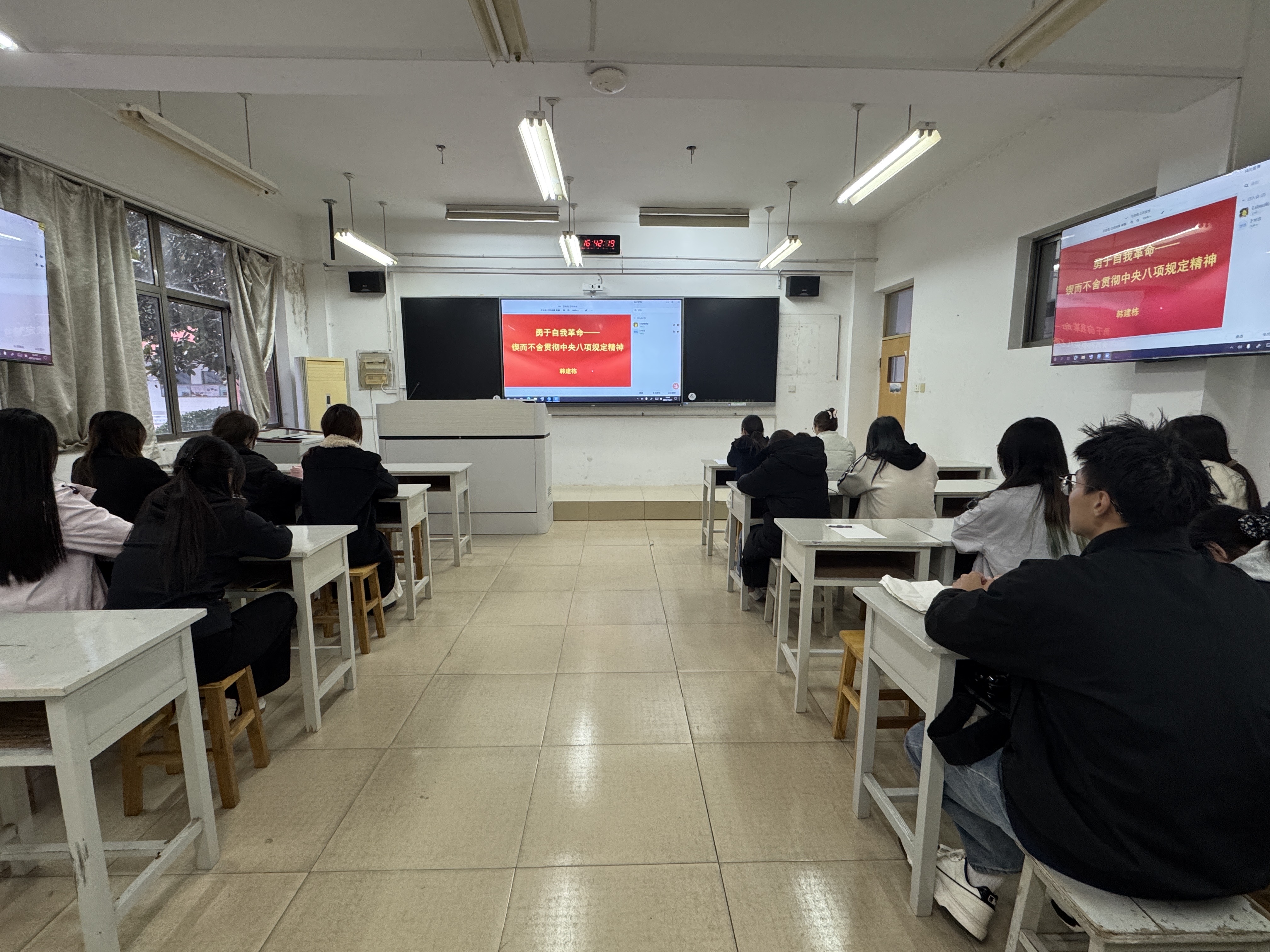韩建栋系统阐释了中央八项规定、实施细则及其核心要义。他强调,开展中央八项规定精神学习教育活动,是党中央基于党和国家事业发展战略全局作出的重大决策部署,学习教育活动虽已结束,但作风建设永远在路上,此次学习教育的价值并未结束,这一活动对于巩固拓展主题教育成效、拉近党群干群距离、推动全面从严治党向纵深发展具有深远影响。他还具体剖析了形式主义、官僚主义、享乐主义和奢靡之风等违背中央八项规定精神的突出问题表现,帮助同学们更准确地把握中央八项规定精神的本质内涵。