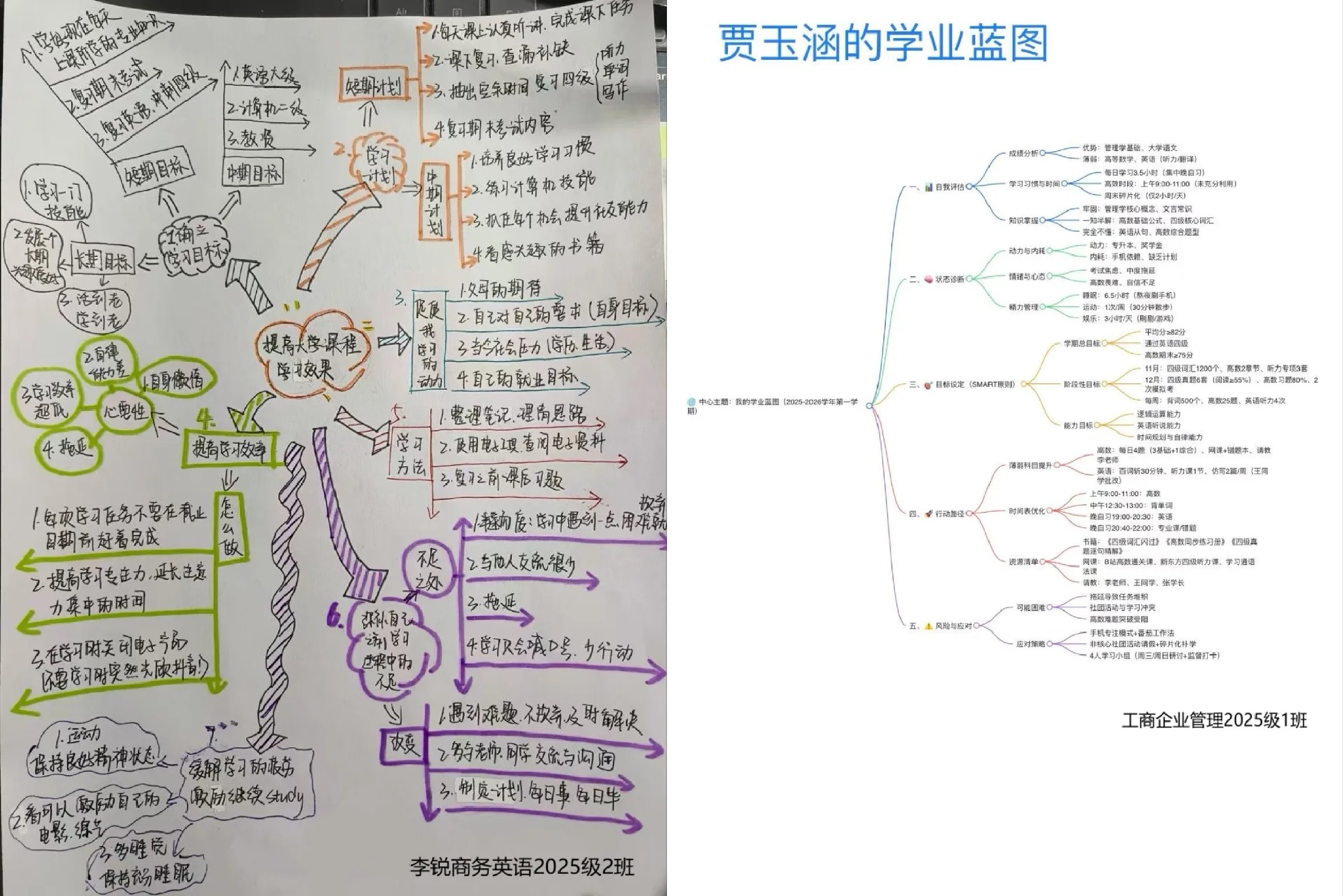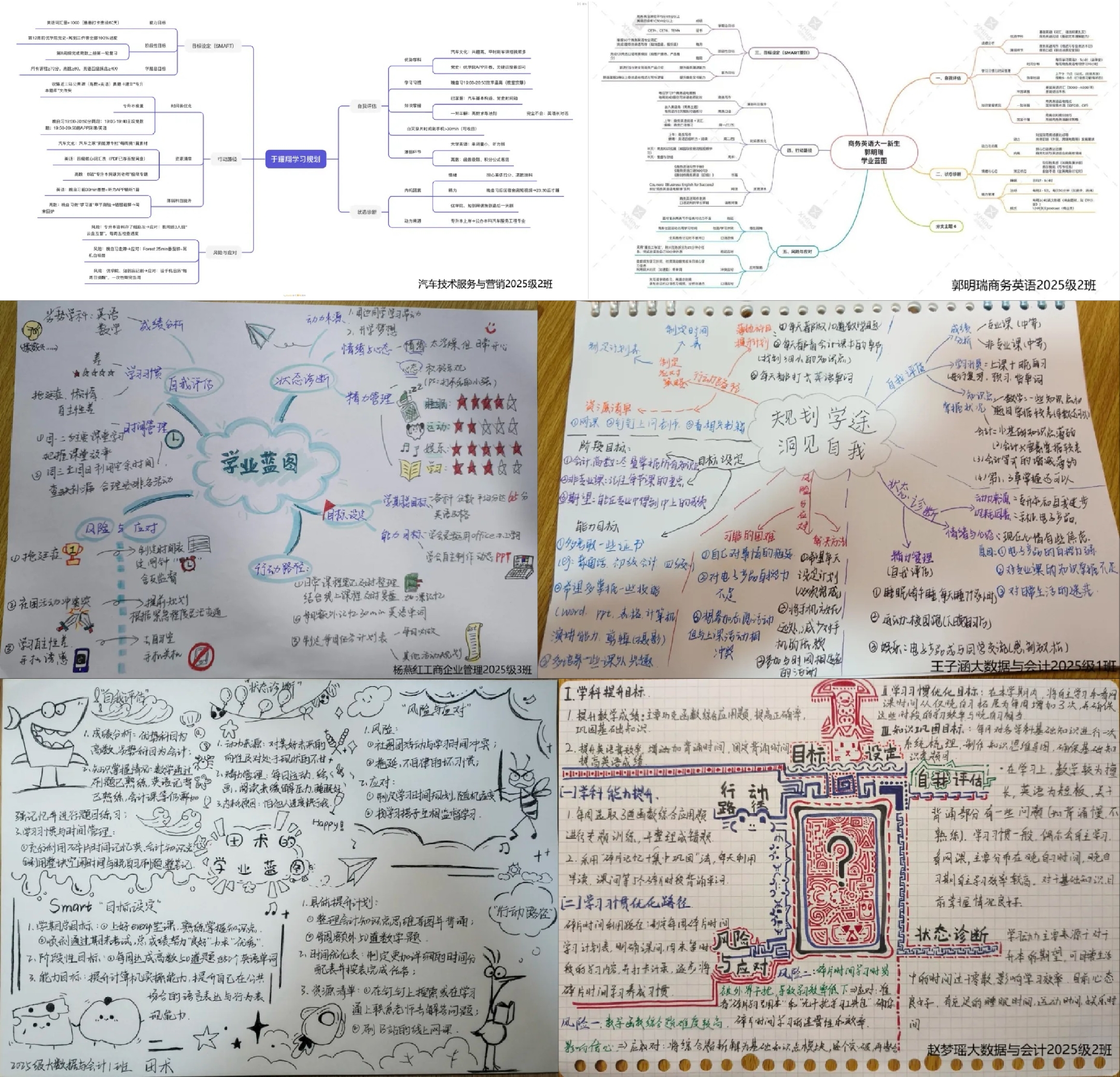 活动以“学业规划思维导图”为载体,围绕“自我评估、状态诊断、目标设定、行动路径、风险与应对”五大维度展开,旨在帮助同学们明确自身优势与不足,制定科学学习计划,从“被动学习”转向“主动规划”。同学们以“我的学业蓝图/学业诊断书”为中心主题,深入剖析当前成绩、学习习惯、动力来源、情绪心态等情况,再依据SMART原则设定学期总目标、阶段性目标与能力目标,规划具体行动路径并预判风险、制定应对策略。同学们绘制的思维导图形式多样、清晰美观、逻辑严谨、方向明确,为学业发展筑牢根基。