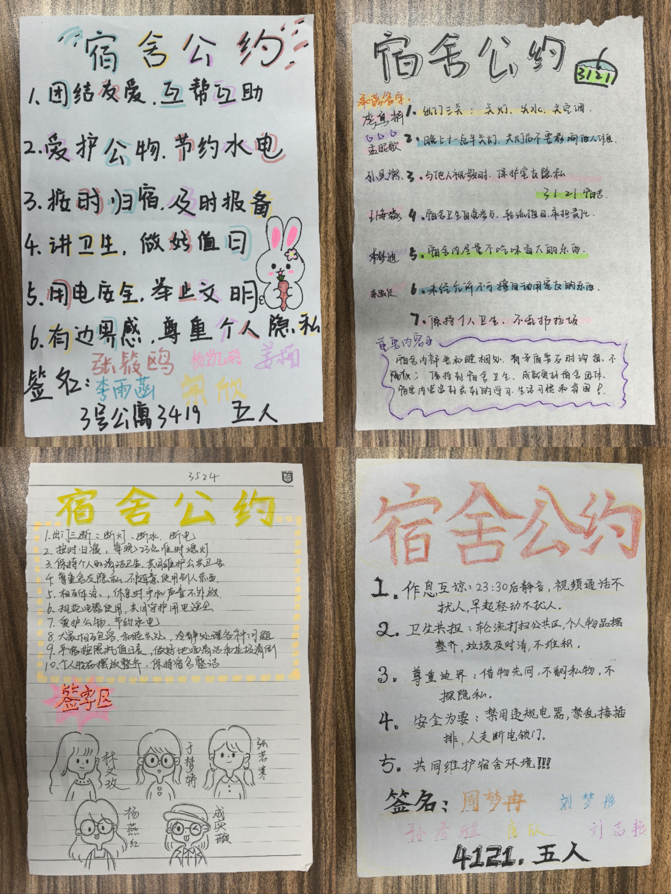 本次活动紧扣“明确责任、规范行为、共建和谐”核心目标,全程突出学生主体地位。各宿舍长先结合校纪校规与实际问题,起草涵盖卫生、作息、安全等维度的《宿舍公约》初稿。随后,宿舍全员参与讨论,围绕值日安排、外卖管理、作息时间等具体问题提出修改建议,并通过民主表决形成定稿。在此基础上,各宿舍共同拟定了百余字的遵守《宿舍文明公约》承诺书,内容聚焦卫生保持、安全意识、作息协调与人际和谐,由代表工整誊写,全体成员郑重签字确认。