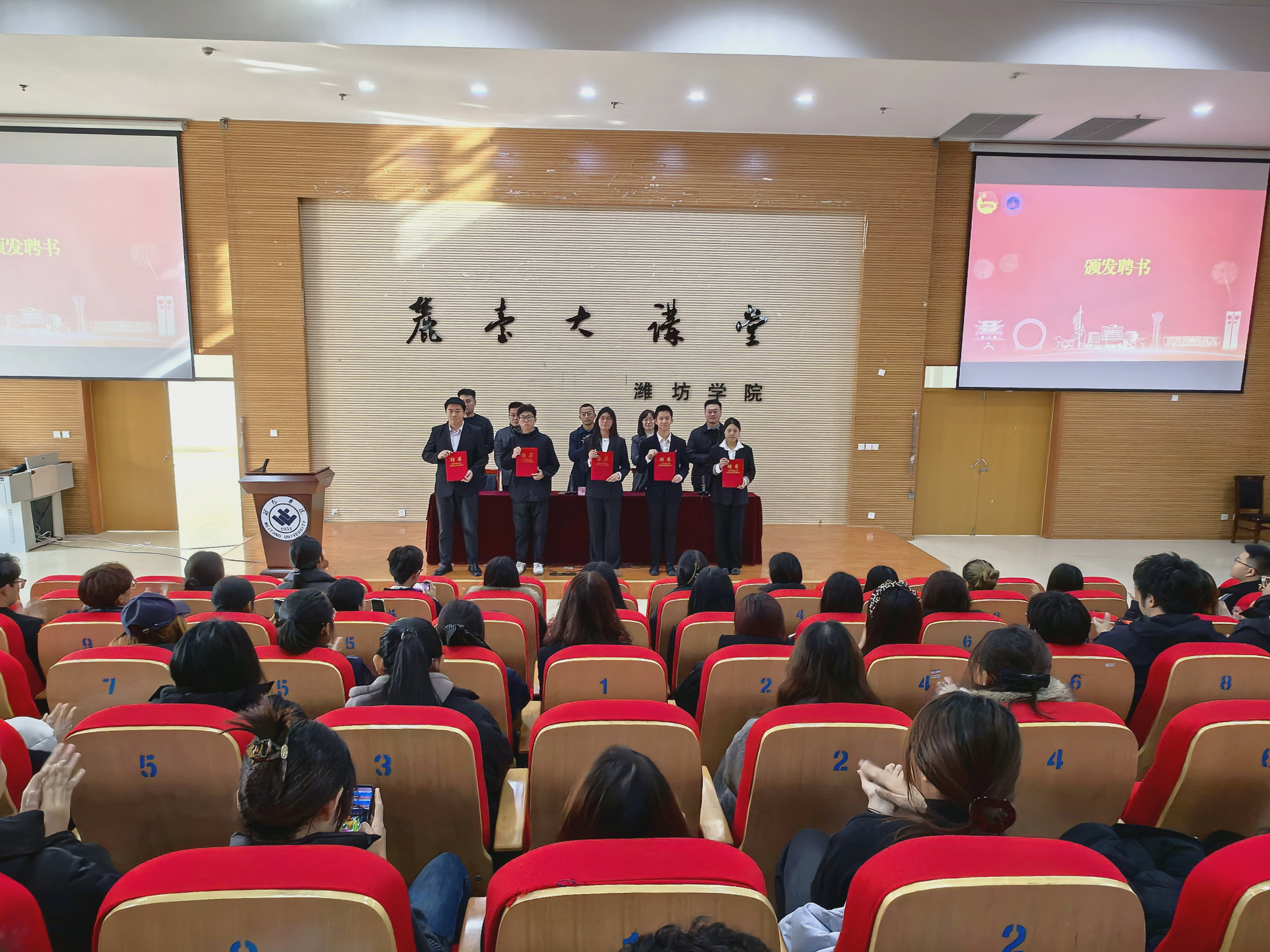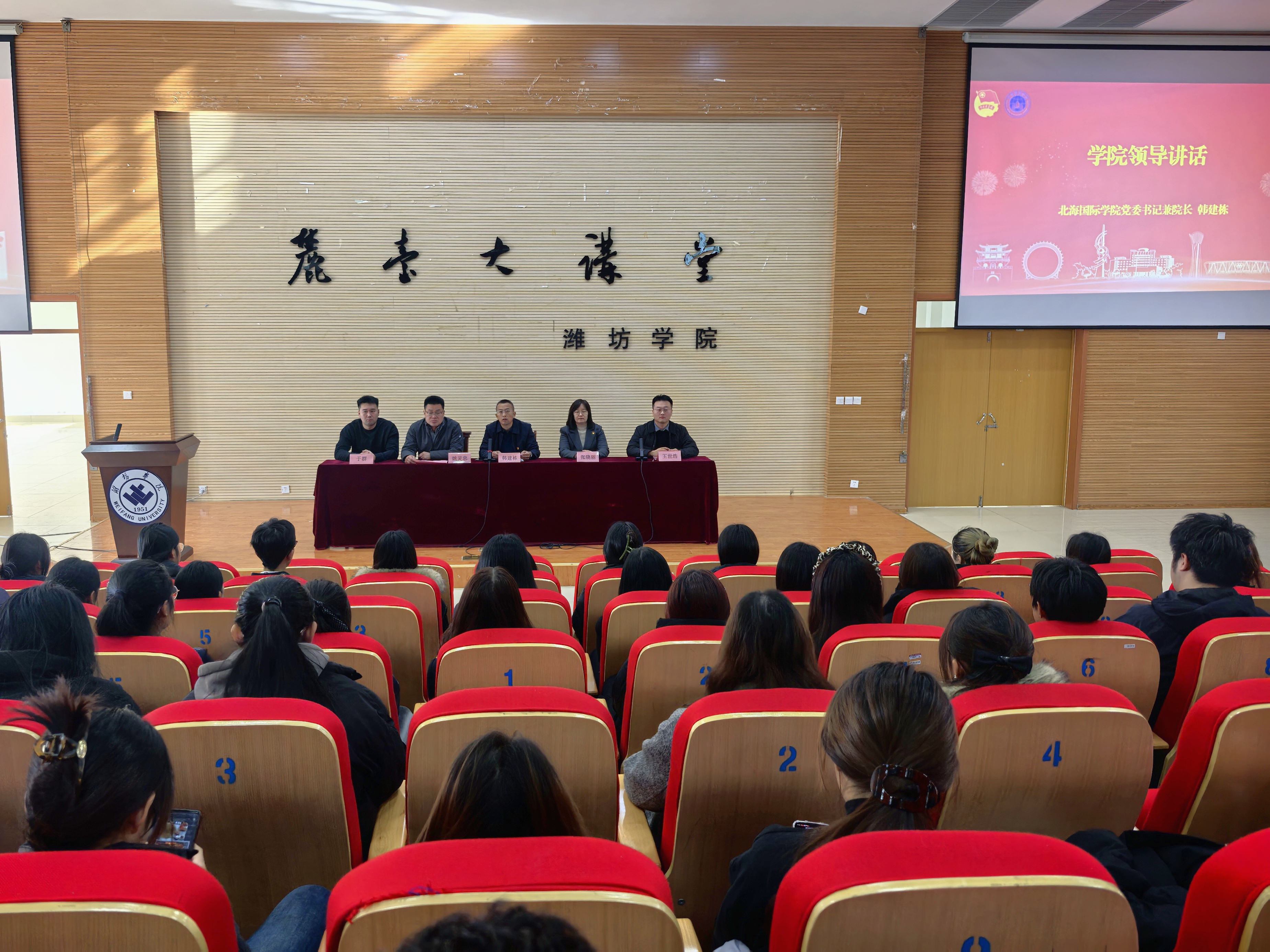 1126日,北海国际学院在安顺校区3号楼4楼报告厅召开2025年团学组织成立大会暨学生骨干秋季培训班开班仪式,学院党委书记兼院长韩建栋,党委副书记、副院长张晓丽出席会议,学院学生工作办公室负责人、团委负责人、全体辅导员、第二十届团学组织负责人、第二十一届团学组织全体成员以及2024级、2025级各班学生干部代表参加会议,大会由学院团委副书记王世浩主持。