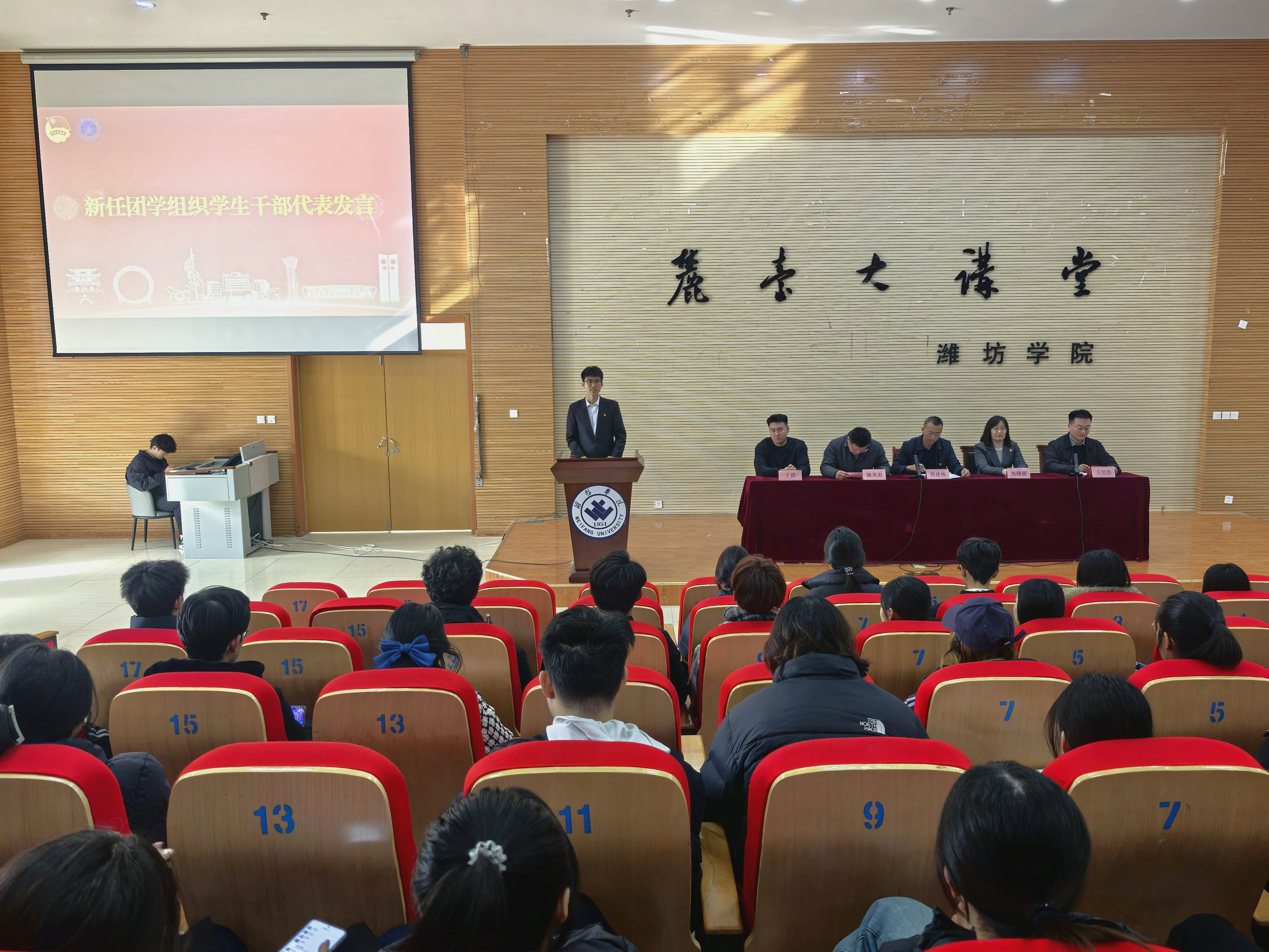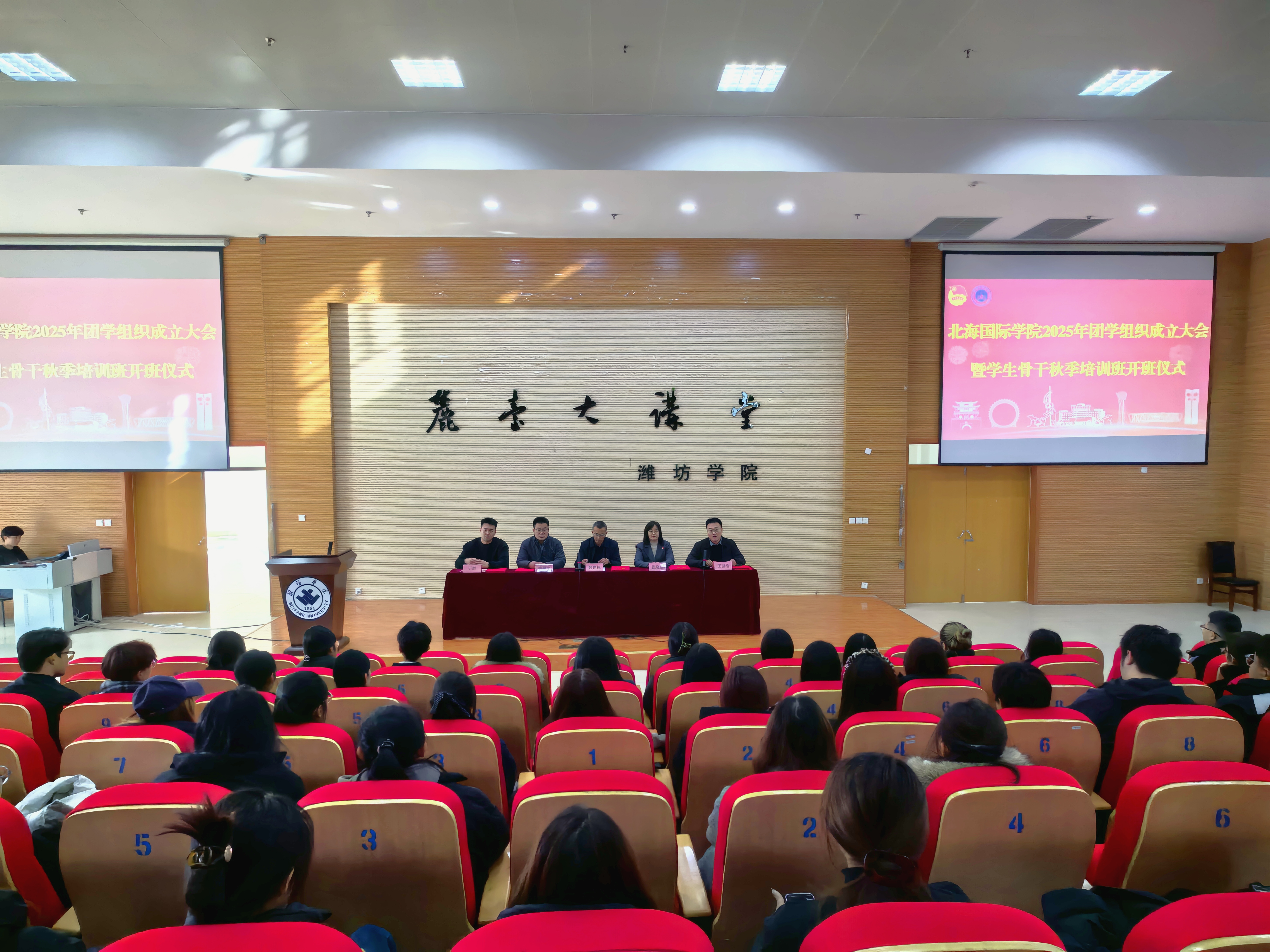 11月26日,北海国际学院在安顺校区3号楼4楼报告厅召开2025年团学组织成立大会暨学生骨干秋季培训班开班仪式,学院党委书记兼院长韩建栋,党委副书记、副院长张晓丽出席会议,学院学生工作办公室负责人、团委负责人、全体辅导员、第二十届团学组织负责人、第二十一届团学组织全体成员以及2024级、2025级各班学生干部代表参加会议,大会由学院团委副书记王世浩主持。