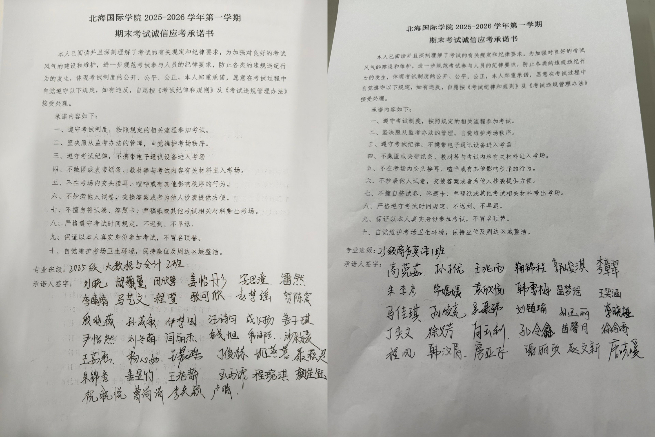为厚植校园诚信文化,筑牢期末考试纪律防线,12月23日,北海国际学院以班级为单位开展期末考试诚信应考主题班会,全院学生现场签署《诚信应考承诺书》,以郑重承诺践行诚信应考准则。