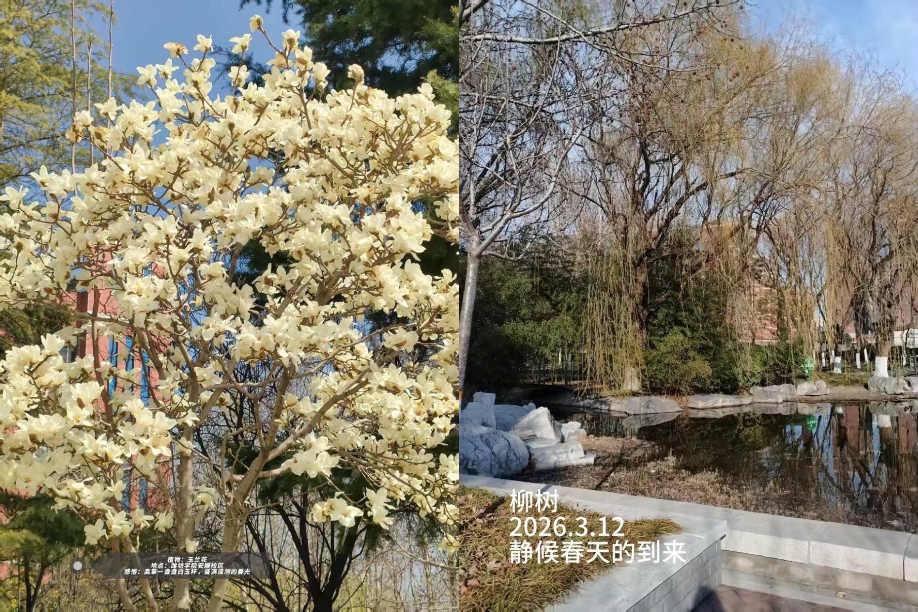活动期间,同学们积极响应、踊跃参与,化身校园“生态记录者”,利用课余时间漫步校园,用手机、相机细心捕捉草木芳华。从悄然抽芽的新枝到竞相绽放的春花到郁郁葱葱的树木,一草一木、一花一叶都被定格成温暖的画面。大家严格按照活动要求,为每幅作品认真标注植物名称、拍摄地点、拍摄时间,并附上真挚的生态感悟,让每一张照片都承载着对自然的尊重与对绿色的热爱。活动全程倡导文明拍摄,同学们自觉做到不攀折花木、不踩踏草坪、不进入危险区域,在欣赏与记录美景的同时,以实际行动守护校园生态环境。