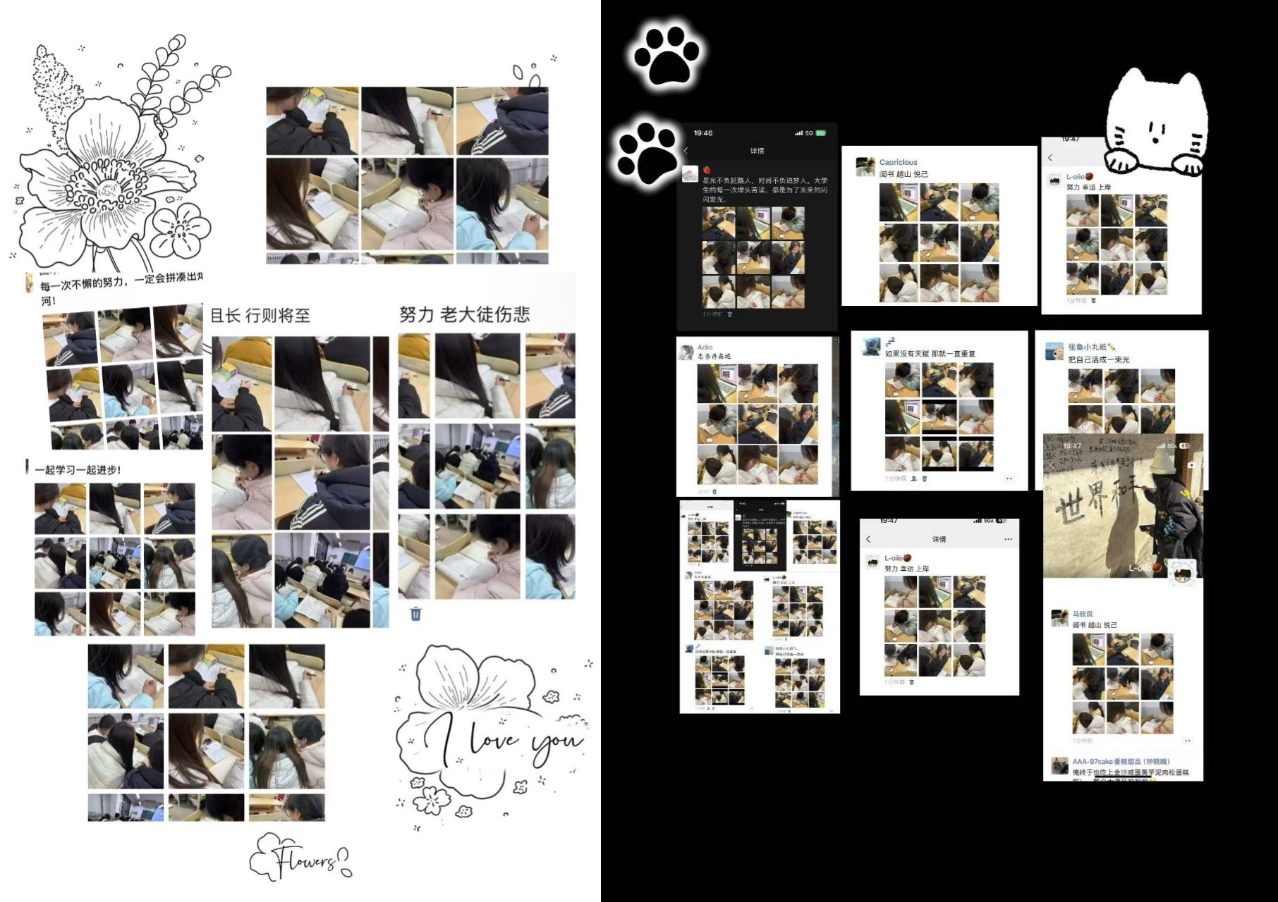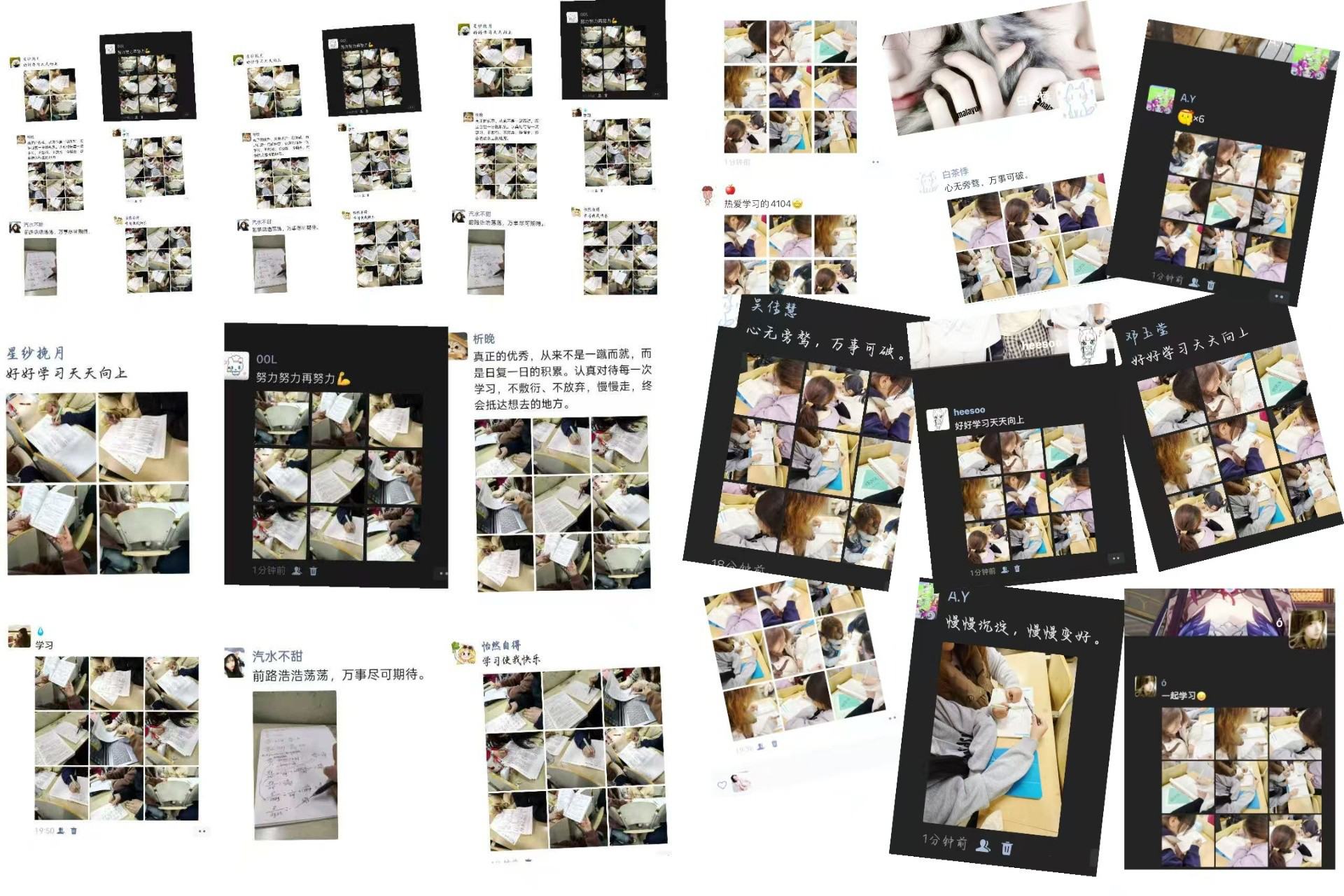 活动鼓励同学们拿起镜头,捕捉校园里专注学习、认真钻研的动人瞬间:无论是图书馆里伏案苦读的身影、自习室中凝神思考的模样,还是课堂上认真记录笔记、小组里协作钻研的场景,都成为镜头下温暖而有力量的画面。同学们将这些精心拍摄的照片,自由组合成专属微信朋友圈九宫格,搭配走心原创文案,在朋友圈分享自己的成长感悟与奋斗日常,让青春的奋进姿态在社交平台传递正能量。活动还融入宿舍集体协作元素,各宿舍成员完成个人朋友圈打卡后,将各自的打卡内容精心汇总、拼接,打造出独属于本宿舍的成长纪念合集,见证彼此并肩前行、共同进步的珍贵时光。