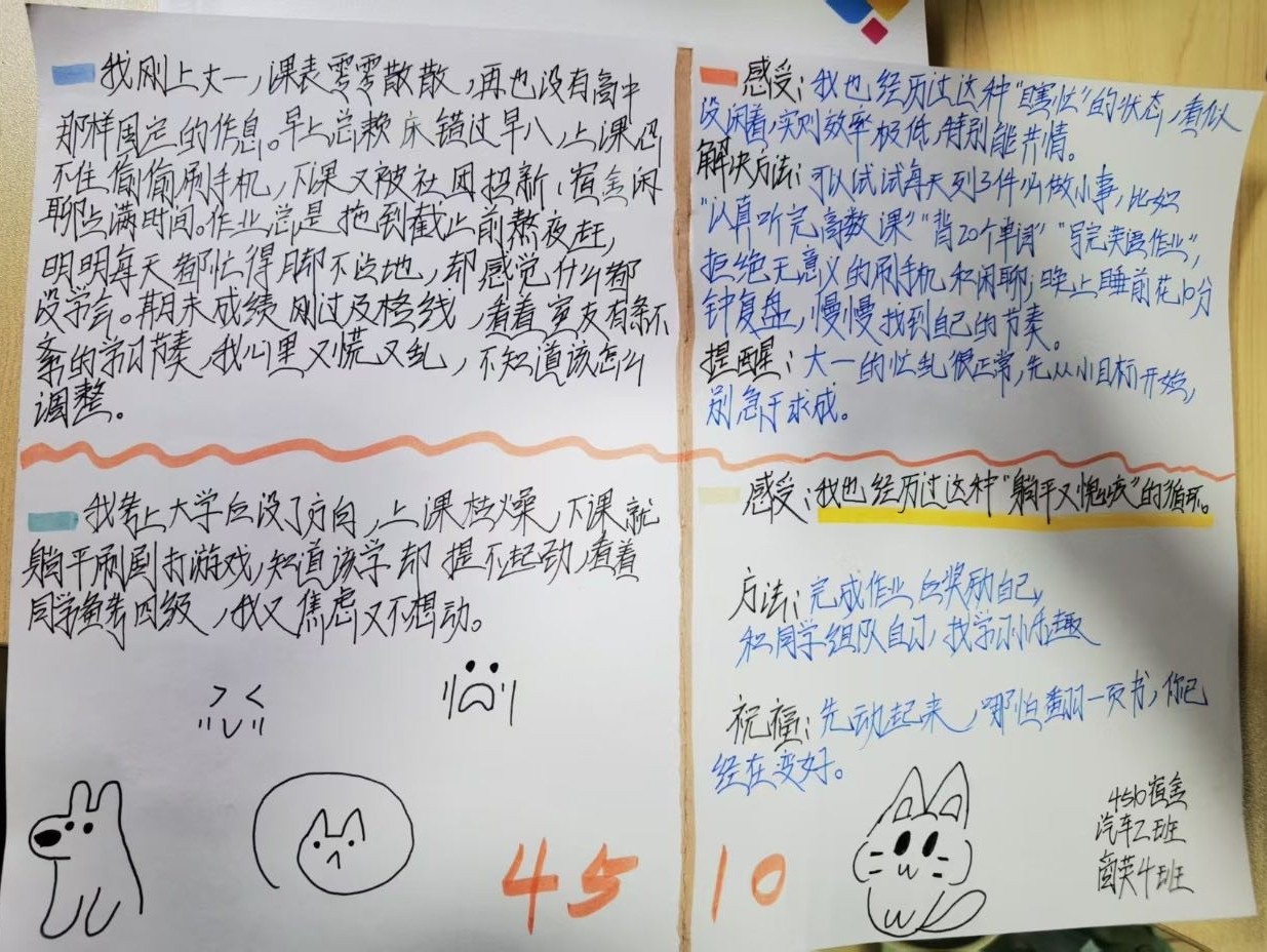 本次活动以宿舍为单位,紧扣大学生学业发展迷茫核心问题,鼓励各宿舍成员结合自身经历,聚焦学业迷茫、目标缺失、学习倦怠、规划模糊等大学生常见困惑,集体创作真实校园微案例,还原课堂走神、作业拖拉、盲目跟风、自我内耗等场景。创作完成后,各宿舍交叉互换角色,透过微案例看见“镜像中的自己”,通过他人分析找到新的解决方法,有效打破独自迷茫、封闭内耗的状态。大家在坦诚交流中正视问题、反思不足,在相互鼓励中调整心态、重拾动力,实现了从被动困惑到主动反思、从消极逃避到积极应对的转变。