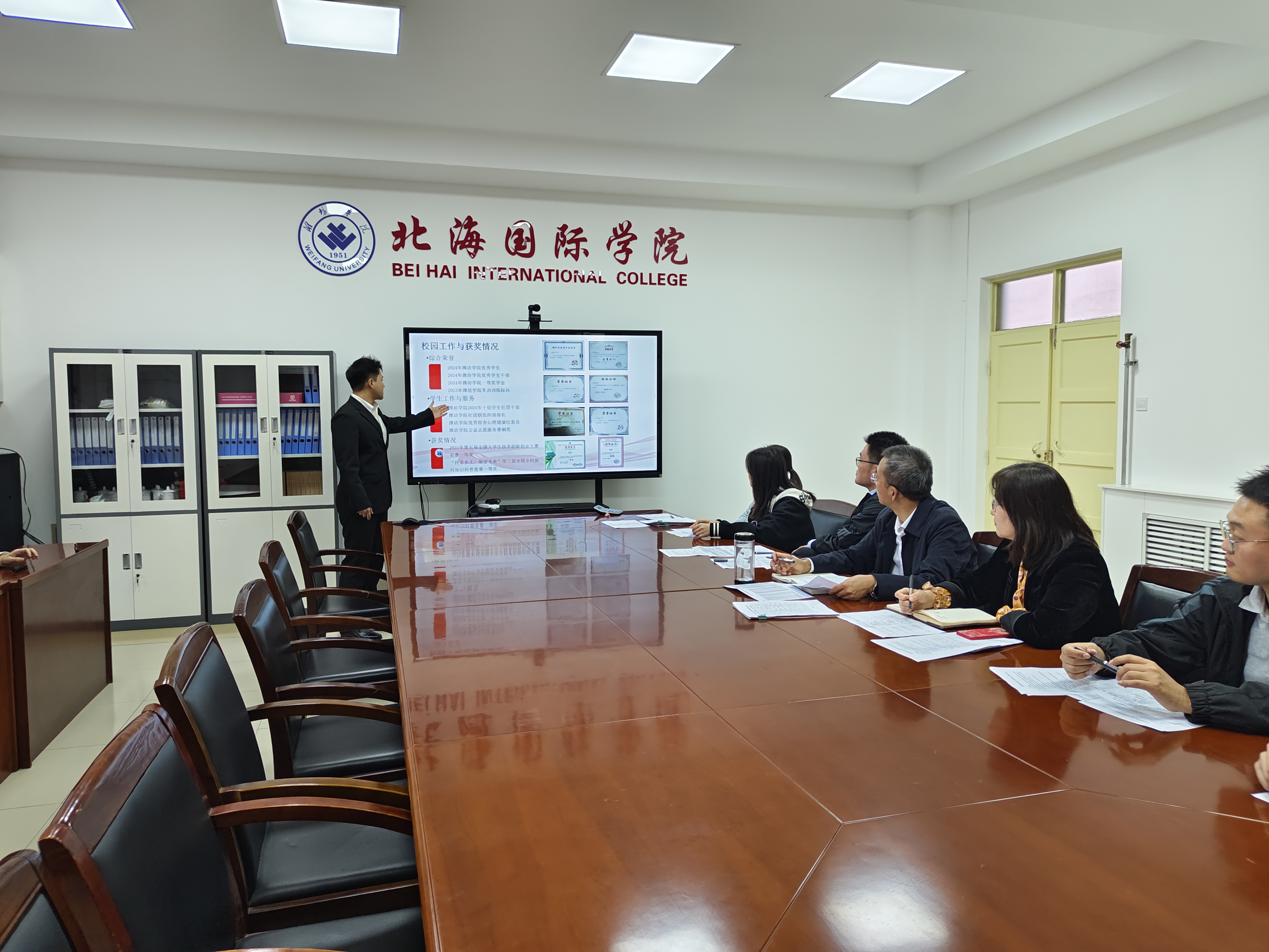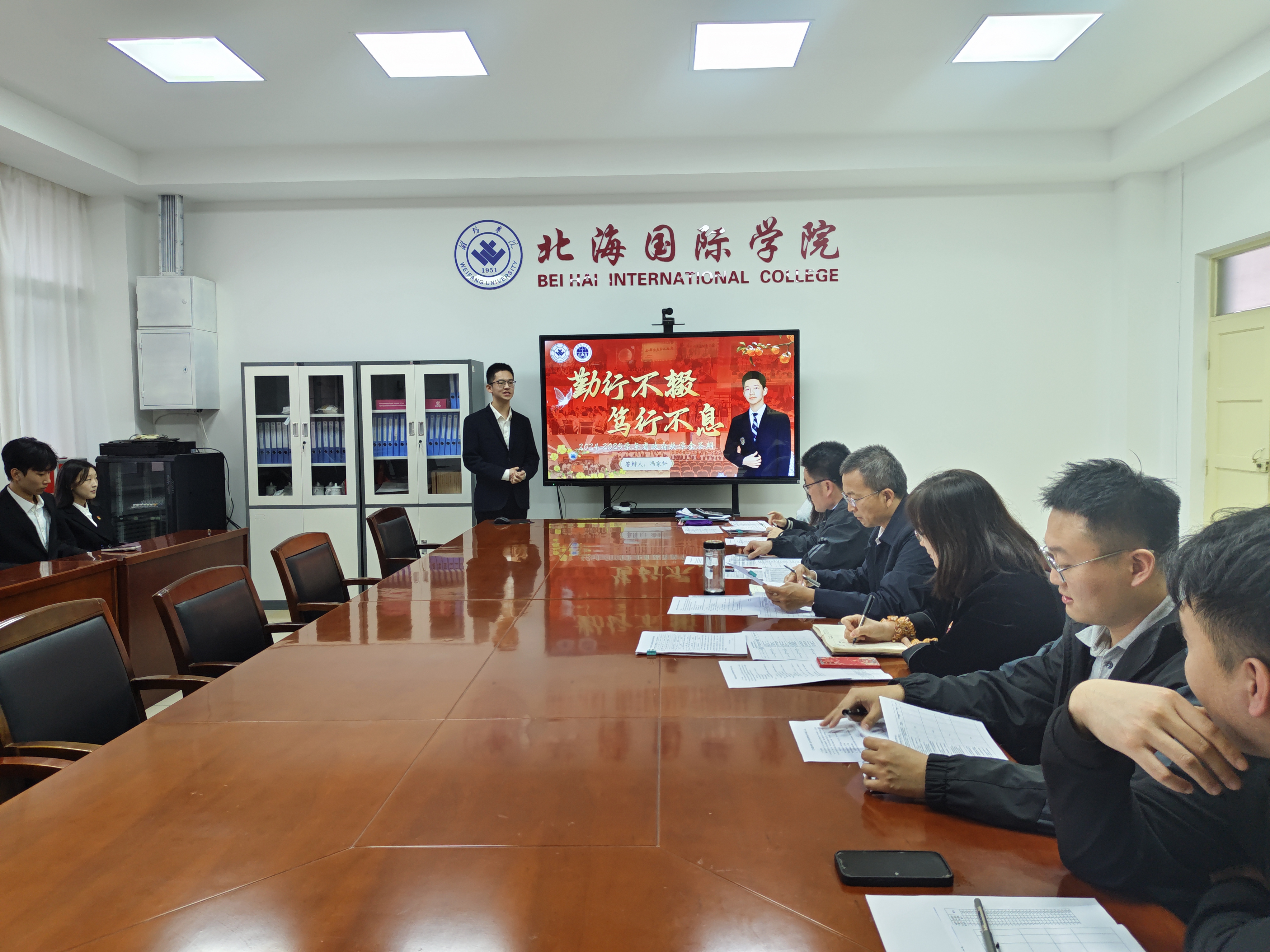 为选树品学兼优的学生榜样,强化奖学金育人导向,10月17日下午,北海国际学院2025年度省政府奖学金评选答辩会在7号楼7516会议室举行,学院党委书记兼院长韩建栋,党委副书记、副院长张晓丽,辅导员、教师代表及学生代表组成评审小组,对全体候选人进行综合评定。